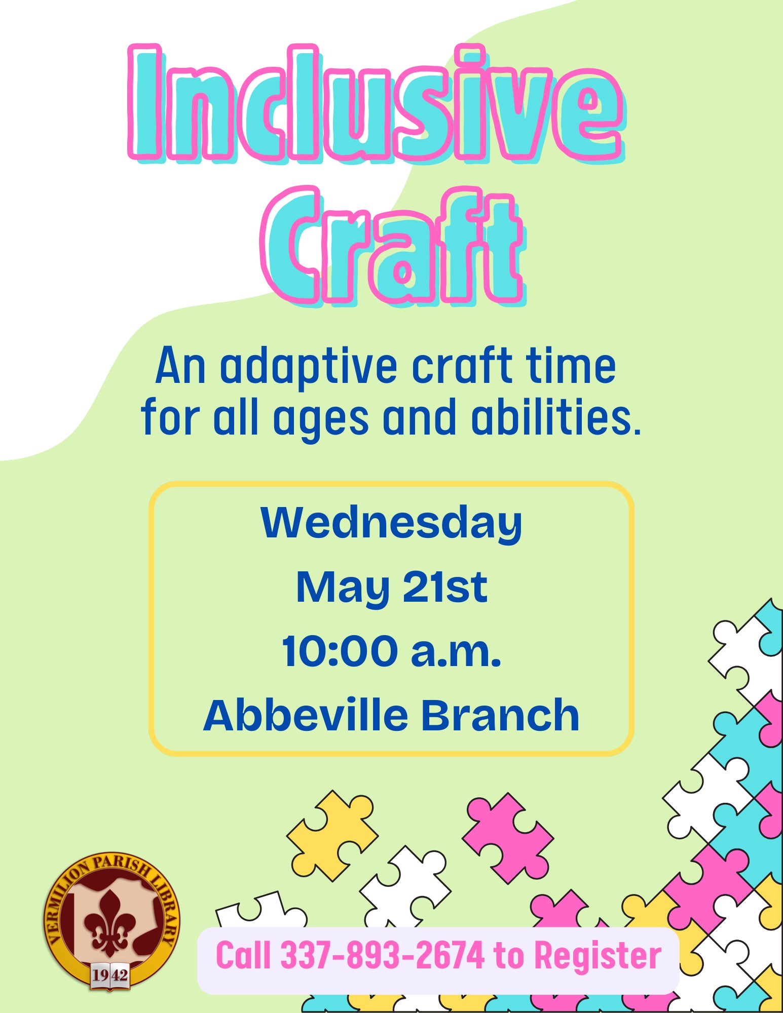 For more information call Lauren at 337-893-2674 or email abbeville@vermilion.lib.la.us